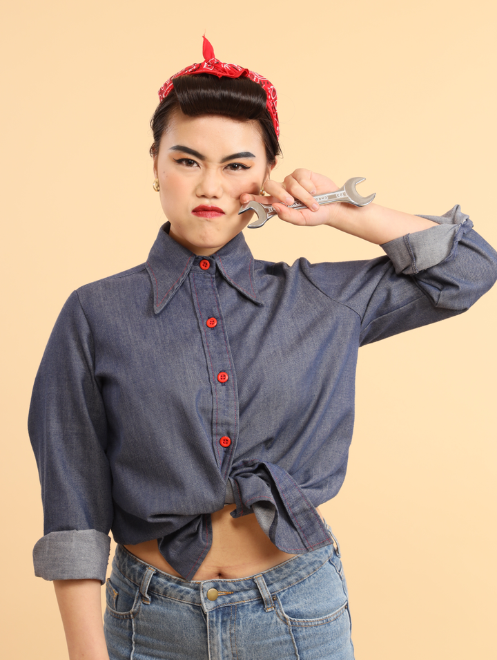 年代別メイクの撮影で、私は50年代に流行したピンナップガールのヘアメイクをしました。ピンナップガールのなかでも車修理のガレージにいる看板娘のピンナップガールにしました。