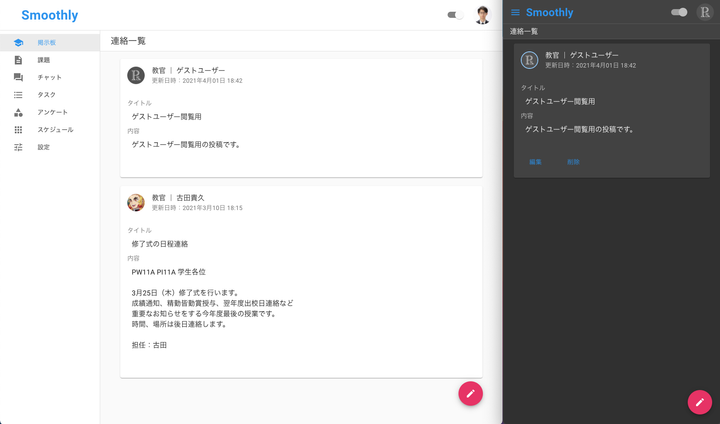 【概要】 私が通っている学校のポータルサイトを SNS 風に改善したサイトになります。 現状は多機能ではあるものの、ページや機能が分散していて使いづらく、UI をモダンな設計にして 1 ページで機能が簡潔できるようにしました。 開発には1ヶ月ほどかかりました。 【使用言語】 ・React(Hooks、Redux) ・Firebase(Authentication、FireStore、Storage) ・Material-UI