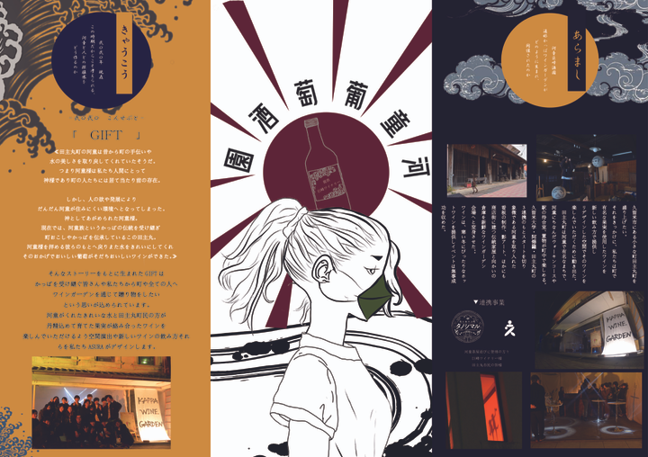 福岡県久留米市田主丸町にて開催した かっぱワインガーデン。 地元で獲れた葡萄を使ったワインを提供するワイナリーさんと大学がコラボし、田主丸町商店街にて町おこしを行う。 2019年に初開催 このデザインは翌年2020年、新たなるKappa Wine Gardenの企画のためデザインした紹介パネル。 学内のオープンキャンパスにて展示。 ※これは個人作品です