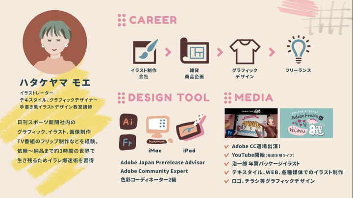 日刊スポーツ新聞社内のグラフィックデザインやイラスト制作、TVフリップイラスト制作業務に従事した経験から、迅速な判断力、スピード感、要望を汲み取りイメージに近いクリエイティブを多彩に提案することが得意です。 - Adobe Japan プレスリリースアドバイザー認定 - Adobe コミュニティエキスパート認定