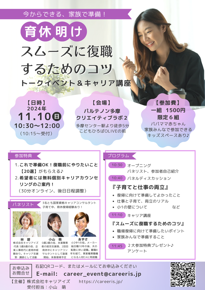 ・職業訓練校キャリアコンサルタント(2024,1~)フルリモート ・Smart相談室カウンセラー(2024,1~)フルリモート ・子育て支援センターにて「育休明け 復職準備セミナー」企画・実施(2024年9月、参加者9名)