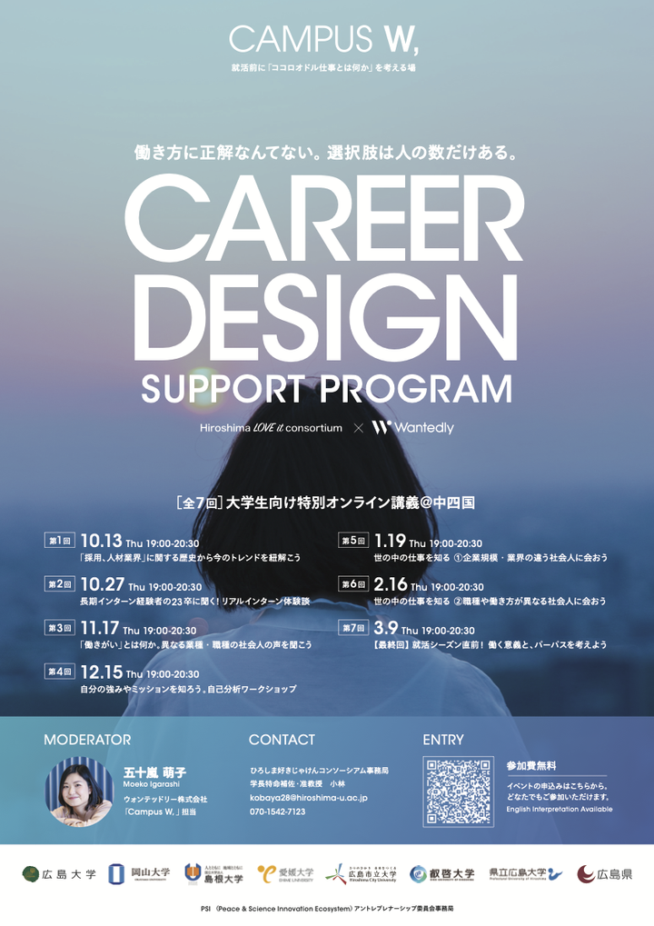 中四国の大学に通う学生向けに、就活やキャリア、シゴトについて考える講義を開催。全7回の講義を企画・運営・実行。ゲストの登壇者アサイン、集客などをメインで行う。申込者数は約200名