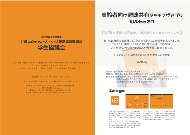 工学・医療・福祉・デザイン・社会科学系・人文学系等様々な分野の学生が大学を超えて、10名ほどでチームを作り、介護現場・高齢者の介護の問題をテクノロジーで解決する提案を行い、プロトタイプまで作成する学生協議会