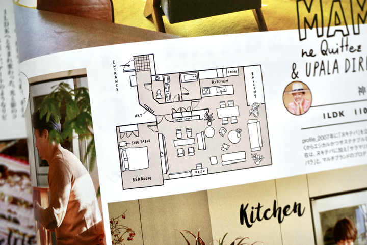 巻頭のインテリア特集で、間取りや文字のイラスト描いてます。