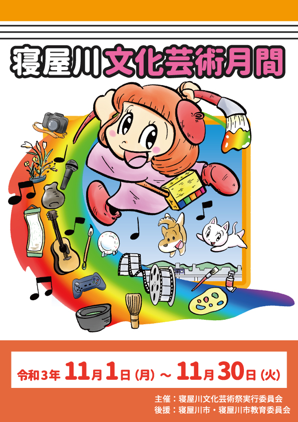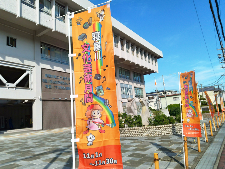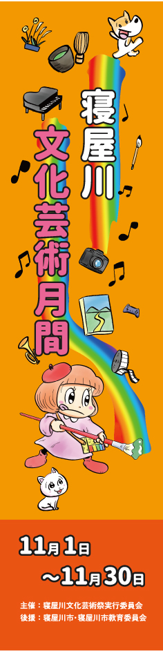 寝屋川市主催の文化芸術のイベントのパンフレット表紙のデザインイラスト、のぼりを制作しました。