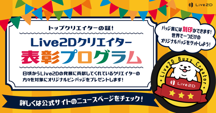 SNSを中心にLive2D作品を投稿しているクリエイターの方々を対象に、日頃の頑張りを表彰する制度を開始。対象者および希望された方に記念品としてオリジナルピンバッジを贈呈。刻印が入れられるそのピンバッジはLive2Dクリエイターの間で特別なアイテムになっています。