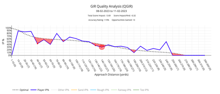GameForgeというソフトウエアを用い、ゴルフデータの詳細を各ラウンド記入し、分析を行った。上記に記載されているデータは、ゴルフを詳細に分け、どの分野がどのようにスコアへ影響しているかを示しており、二枚目の画像は距離によりグリーンを捉える確率をツアーと比較して表している。