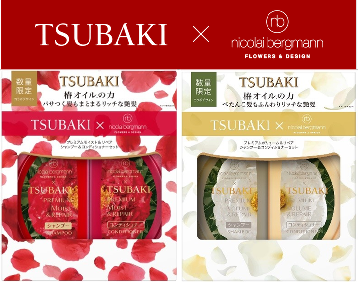 TSUBAKIとコラボレーションした限定パッケージ「TSUBAKI プレミアムモイスト&リペア」「TSUBAKI プレミアムボリューム&リペア」シリーズのボトル及び外箱のパッケージデザイン