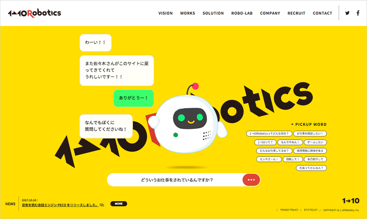 1→10Robotics (ワントゥーテンロボティクス) のウェブサイトをリニューアルしました。 ウェブサイトでは、モッチがみなさまをご案内さしあげます。 https://vimeo.com/243145640