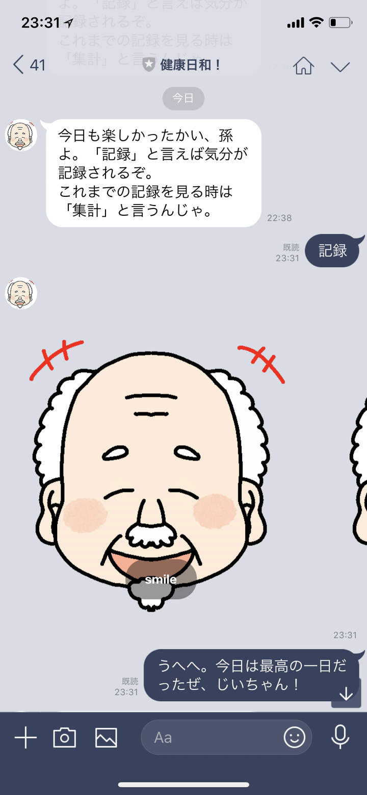 GasとGoogleSuitサービスで完結した単純なBot ・その日の気分をアンケートで回答 ・回答によってじいちゃんがランダムに元気づけてくれる。(リプライなので個別返信) 変なこと言うと方言でツッコんでくれる ・テキスト情報も一緒に記録できる(解析は後日やろうとはおもってる笑) ・集計で友達全員の集計値が見れる(別のページで) ・ヘルプで使い方見れる djnagnoで天気やFItbit、その他のウェアラブルから睡眠データと組み合わせて機械学習で次の日の気分を予想させるアプリを作成中