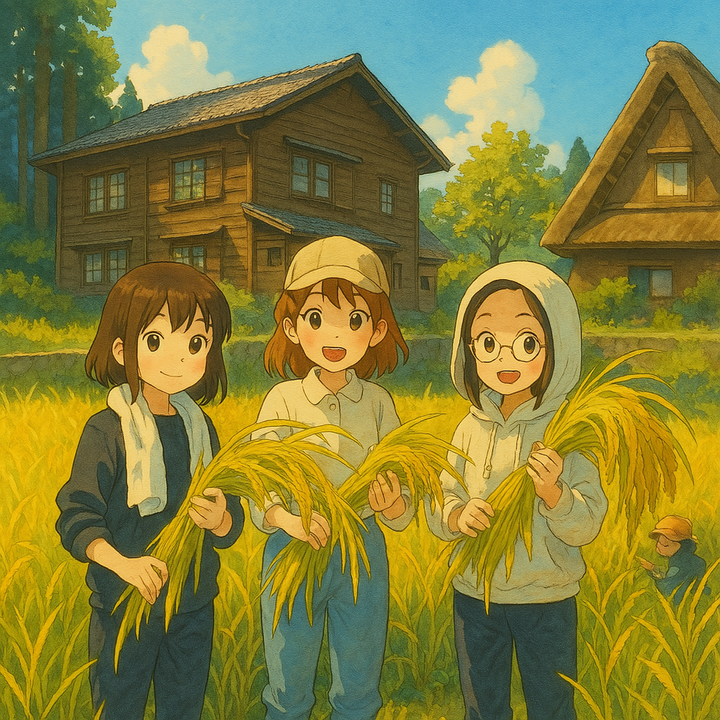 南砺市の応援市民として,金沢大学が参画している南砺市での活動に参加してきました. 〜これまでに参加したイベント・プロジェクトの例〜 世界遺産の棚田オーナー:田植え(2023/2024)・稲刈り(2024)・はさ掛け(2024)・収穫イベント(2023) 畜産・牧場体験(2022)<https://co-creation.w3.kanazawa-u.ac.jp/zatsudan/zatsudango491/> 五箇山かぶら(2022):種まき・間引き・収穫<https://www.kanazawa-u.ac.jp/news/113803> など ※肖像権保護のため,画像は実際の写真をChat GPTでジブリ風にしています.