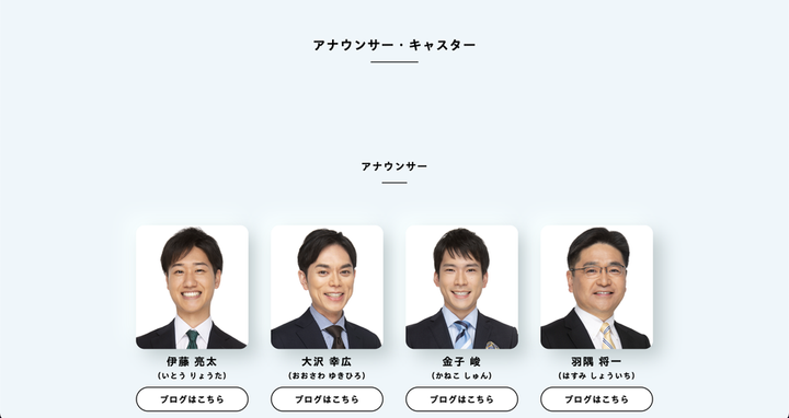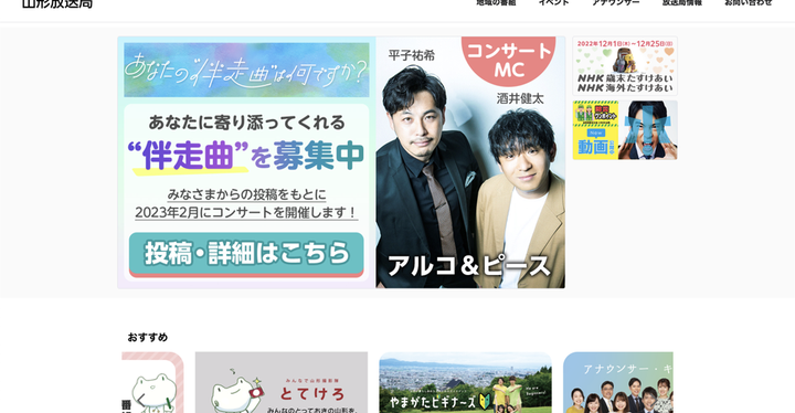 1.山形ビギナーズという、山形移住初心者の学生を対象としたガイドブックの周知ページを作成 素材はガイドブックからの流用だが、ヘッダーの薄緑色の部分は実際の山形の山並みをPHOTOSHOPで素材化して使用したもの。他イラストキャラのアニメーションやスライドなども自力で実装しています。 2.アナウンサー・キャスターページ https://web.archive.org/web/20230404064001/https://www.nhk.or.jp/yamagata/caster/ NHK共通のヘッダーフッター以外の部分のデザインとコーディングを担当。 スマホでの閲覧者が多いことも想定して、ブラウザレスポンシブをスマホ〜タブレット〜PCとスムーズに移行するように調整しています。