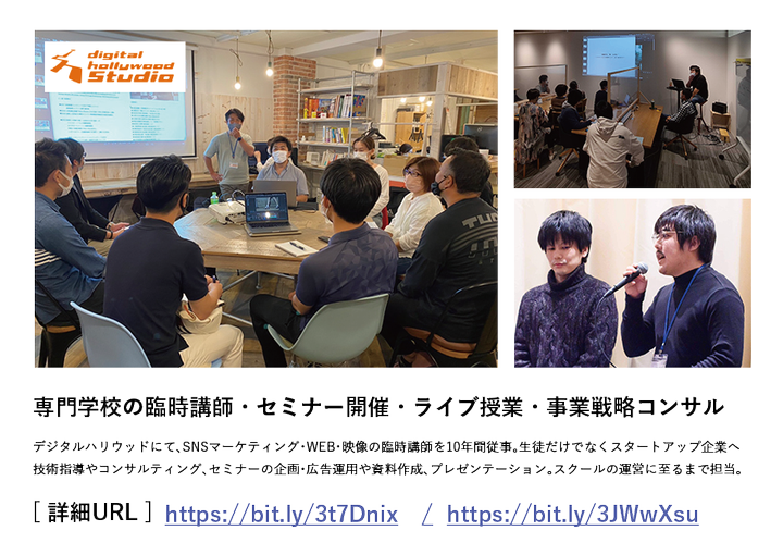 デジタルハリウッドにて、SNSマーケティング・WEB・映像の臨時講師を10年間従事。生徒だけでなくスタートアップ企業へ技術指導やコンサルティング、セミナーの企画・広告運用や資料作成、プレゼンテーション。