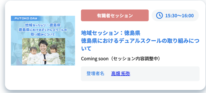 【登壇実績】『FUTOKO DAY 2022 』徳島県におけるデュアルスクールの取り組みについて(株式会社クラスジャパン学園主催|2022/02/20) 株式会社クラスジャパン学園が主催する、不登校のための大規模カンファレンス『FUTOKO DAY 2022 』にて、徳島県におけるデュアルスクールについて体験者としてお話しました