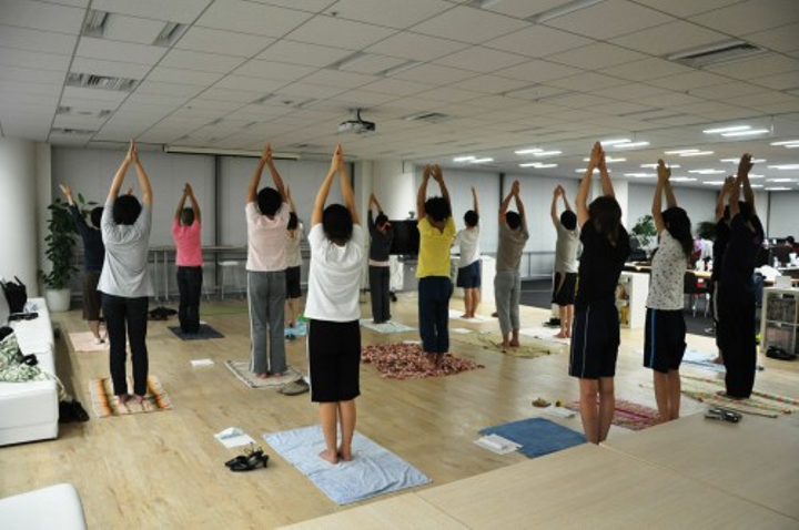 社員の交流・健康促進のため月に1度ヨガの先生をオフィスに呼んで、ヨガクラスを行いました。そのときの様子。
