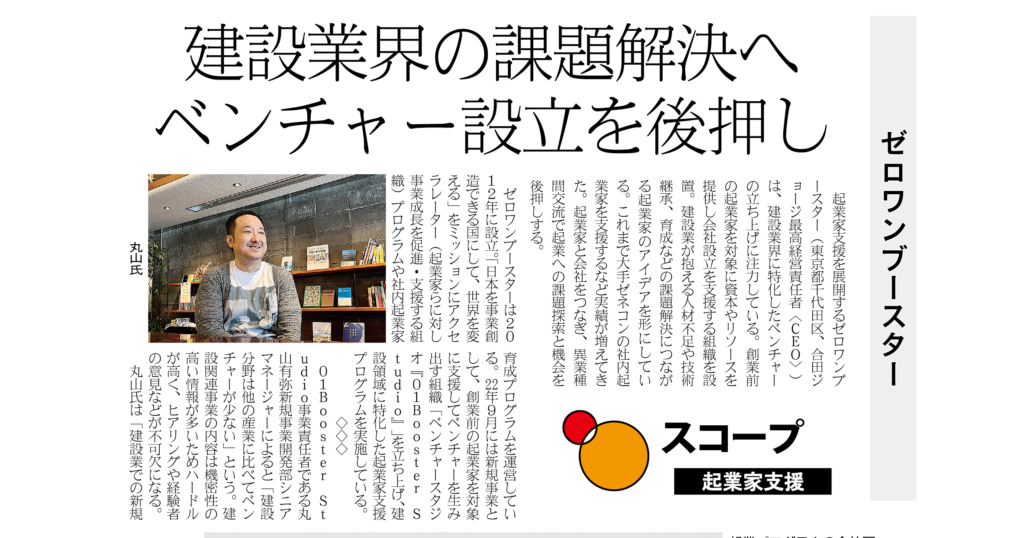 2010年に大林組へ入社。鉄道および都市土木工事の設計・施工管理、再生可能エネルギー等の新規事業開発を経験。2021年に01Boosterに参画し、アクセラレーター運営・スタートアップ投資を経て、事業責任者としてベンチャースタジオ「01Booster Studio」を新設。2024年にベンチャー2社を創業。MBA、建設及び環境工学修士。1級土木施工管理技士。