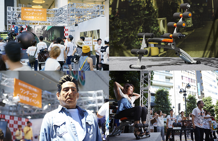 腹筋マシーンの店頭体験をエンターテイメント化。 器具を体験すると、当時話題だった面白CMに、まるで自分が登場しているかのような動画をシェアできるイベントを開催。 体験している様を、その場で撮影・編集しWEBにアップロード、URLを渡すシステムを構築しました。 ユーザーの体験演出と動画内容のプランニング、撮影〜編集〜動画アップロードまでのシステムの企画設計、ユーザー体験まわりの導線のディレクションを担当。