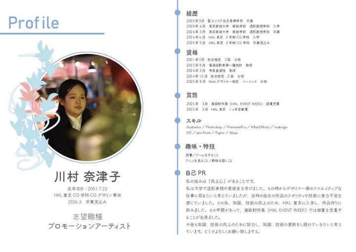 東京家政大学造形表現学科で造形表現や美術史を学び、現在はHAL東京にてデザインについて学んでいます。26年卒業見込み。