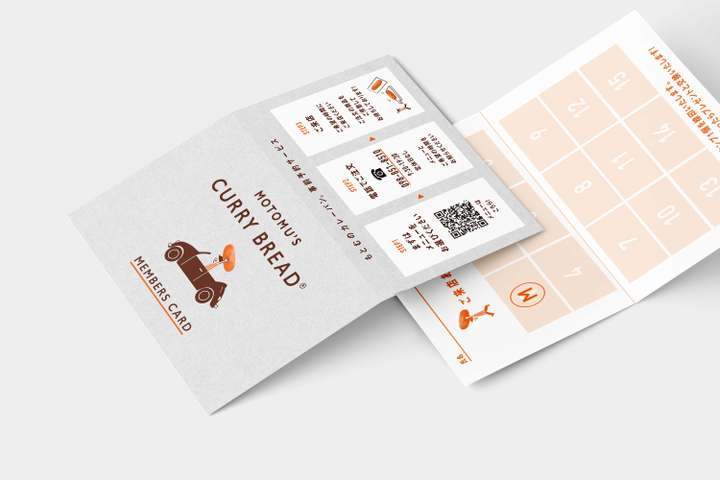 「もとむのカレーパン ウミカジテラス店」のスタンプカードを制作しました。 地元の方がずっと車の中に置いておきたくなるように、もとむくんがオープンカーに乗っているイラストを描きました。 裏面は「事前予約サービス」の流れとし、便利なスタンプカードを目指しました。