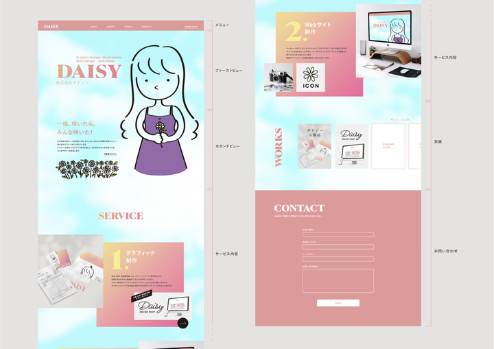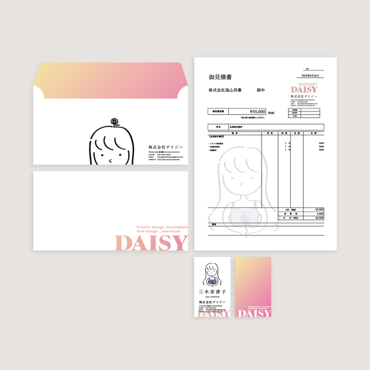 個人事業主になり、自身のデザイン制作ブランド「Daisy Design」を立ち上げ。名刺・封筒・見積請求書やWebサイトをデザインしました。コンセプトやイメージを統一して、見る人の印象に残るように設計しています。