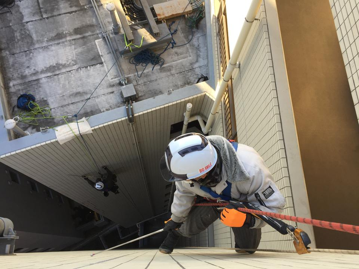 ロープにぶら下がっている感覚は、ジップラインのような感覚で楽しんで取り組んでおります。もちろんロープの扱いに自信があるから言えることですので、事前のロープ講習や高所作業教育を経て【安全第一】で作業行っております。