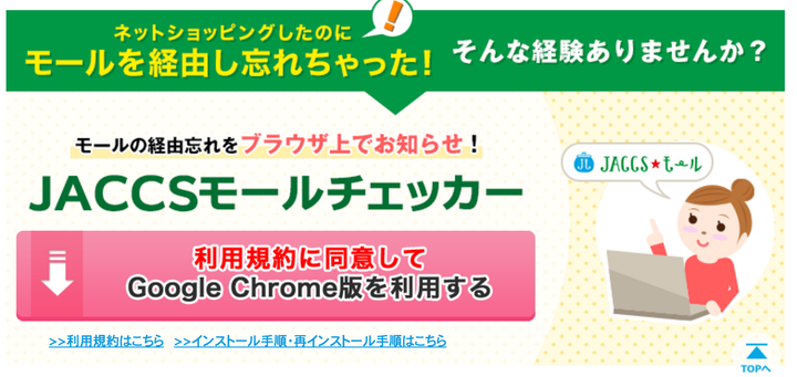 JACCSモールの経由忘れを防いでくれる便利なツールが登場しました! JACCSモールに掲載中のショップにアクセスすると、アイコンが光ってお知らせ! ショップ通知のポップアップからJACCSモールを経由してショップへアクセスし、いつも通りお買い物をするだけ! JACCSモールからのショップ検索を省略して、ラブリィポイント・Jデポがたまります。