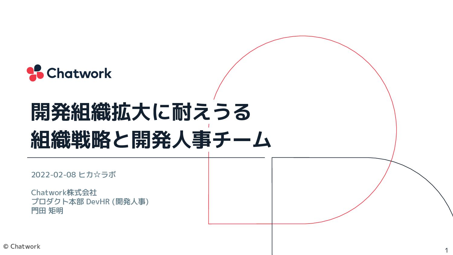 4年間で開発メンバーを30名から100名へ エンジニア採用戦略と事業をスケールさせる組織設計 https://peatix.com/event/3112465/view のイベントで発表したスライドです。 Chatwork開発組織における直近の組織戦略と開発人事(DevHR)での取り組みについてまとめました。