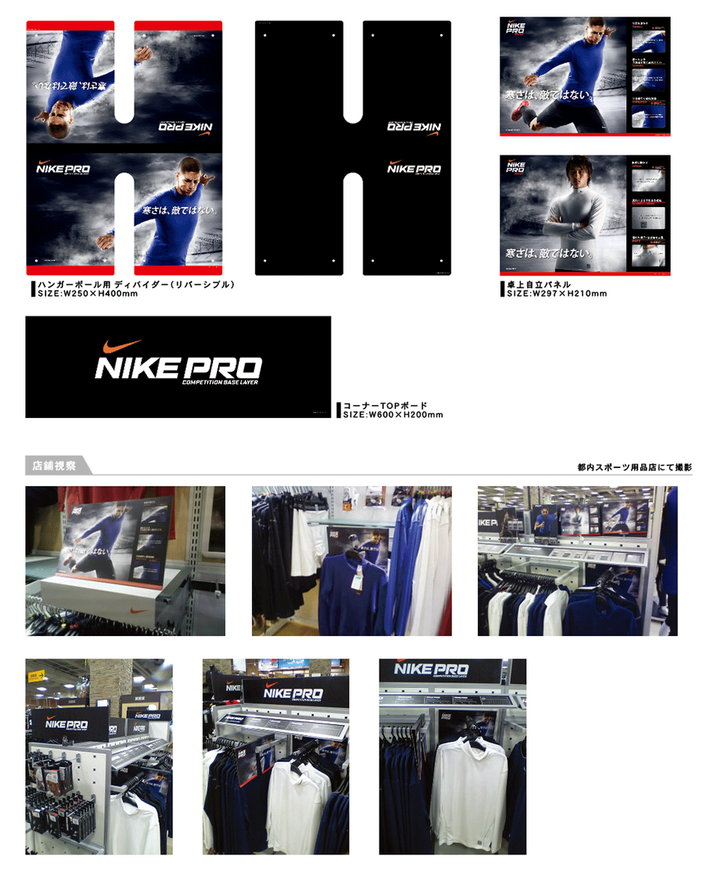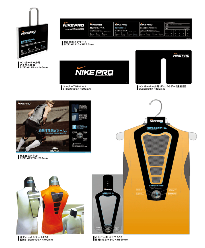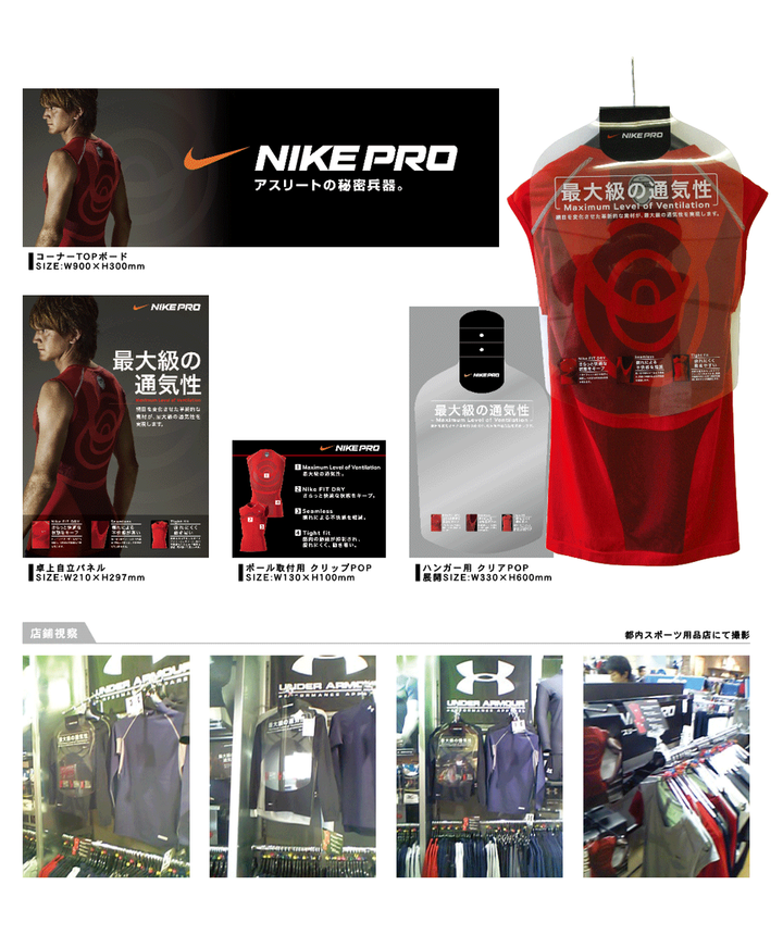 ◆株式会社ナイキジャパン アンダーウェア NIKE PRO (SPツール企画) ・新商品のキックオフミーティング ・店舗を周り競合他社調査 ・クライアントの要望を叶える新SPツールの企画提案書作成(デザインはラフ) ・提案をクライアントとブラッシュアップ ・制作するSPツールのグラフィックデザイン制作 ・各印刷業社に問い合わせてSPツールの実現性を確認 ・実物のモックアップを制作し、クライアント確認〜修正 ・グラフィックデザイン入稿