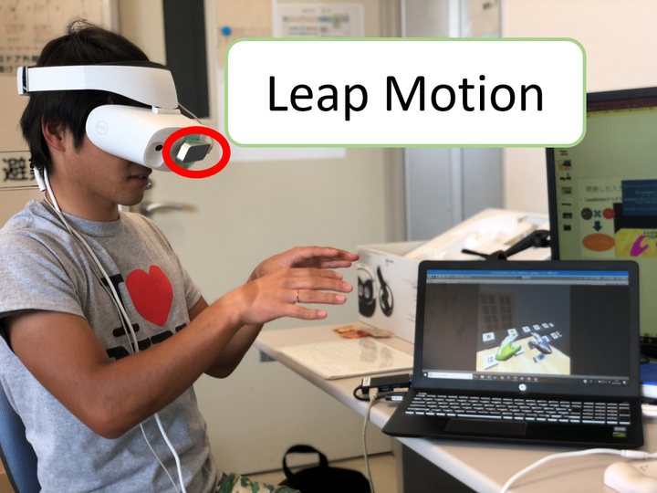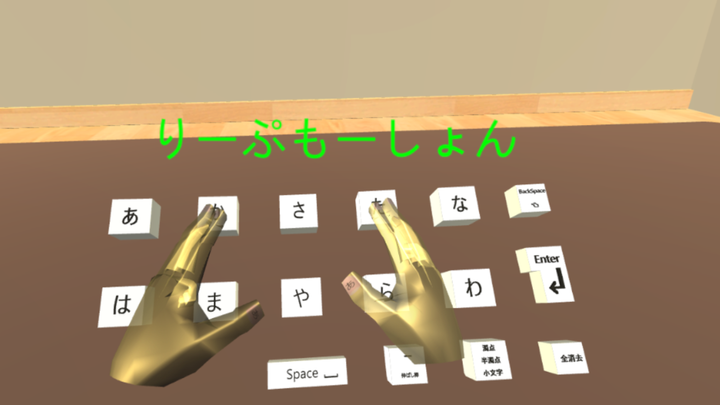 コントローラーを持たずにひらがなを入力できるシステムの提案です。10個のキーとそれを押す5種類の指の組み合わせで50音を入力します。 ハンドトラッキング機能の無いWindowsMRヘッドセットにLeap Motion(ハンドトラッキングセンサ)を取り付けることでハンドトラッキングを可能にしました。