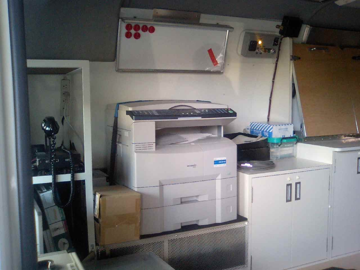 車両内でFAXと同じ使い方で利用できるデジタル機器を設計、開発。 回線はIP網でワンタッチで事務所などに紙が送付や受信できる。