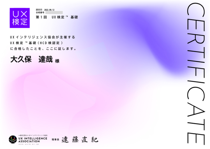 UXや人間中心設計の基本的な概念や実践方法を理解し、業務に活用するために資格取得に取り組んだ。 学習推奨図書(アフターデジタル2 UXと自由、UXグロースモデル アフターデジタルを生き抜く実践方法論、人間中心設計入門、ユーザビリティエンジニアリング)を2週+UXデザインの教科書を読んで学習。 ■試験概要 ・第1回:2022年 8月 6日実施 ・受験料:10,890円(税込み) ・100問/100分 ■学べたこと ・UXインテリジェンス※の理念 ※デジタル前提時代(データ取得が容易になったアフターデジタル時代)に、より自由で豊かな社会を作るための、ビジネスに関わる全ての人が持つべき精神やUXを企画する能力のこと。 ・UX関連の基礎知識 ・UXプロジェクト計画 ・ユーザー理解 ・ユーザー要求定義 ・UXデザインの具現化 ・UXデザイン評価 ・UX運用・グロース ・UX組織化