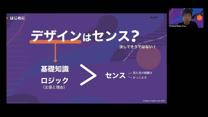 はじめてデザインをする大学生の方たちに向けて、UIデザインとは?、チーム制作でのアイデア共有と視覚化、デザインの基礎、表現方法などをオンラインでレクチャー。 イベントレポート https://edex.adobe.com/jp/college-creative-jam-2021