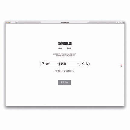 人々が立法に参加するGitLawという構想に触発されて制作。 日本国憲法原文を参照しやすく、変更しやすくするため、論理プログラミング言語Prologの形式に変換。 【技術】HTML/CSS/JavaScript/Prolog/GitHub