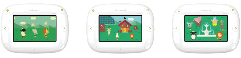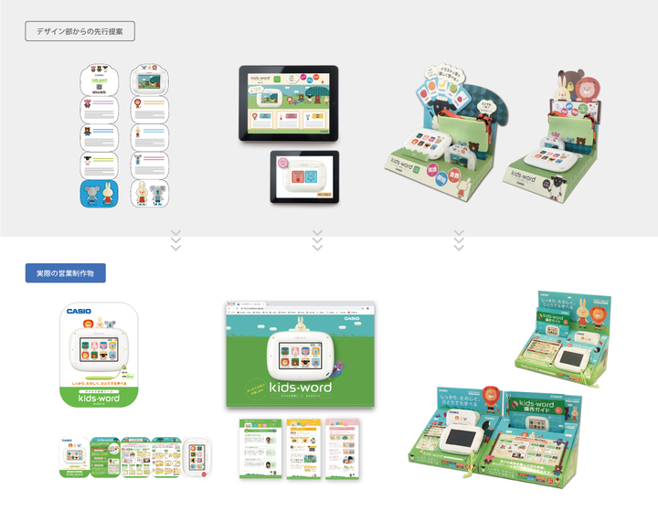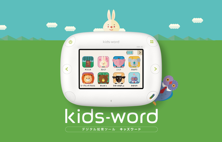 未就学児向け学習ツール「Kids-word」の開発。 商品企画の部分から携わり、学習コンテンツを進めていくともらえる「ごほうび」演出の物語を考案。進捗にしたがってホーム画面に動物たちが増えていき、学習の楽しみを感じてもらう。 また、パッケージデザインや、オプションの専用ケースのデザイン、社内SP に向けた専用展示什器の提案などを行い、コミュニケーションデザインとしてトータルでデザインを担当した。 ※イラストレーター:外部クリエイター