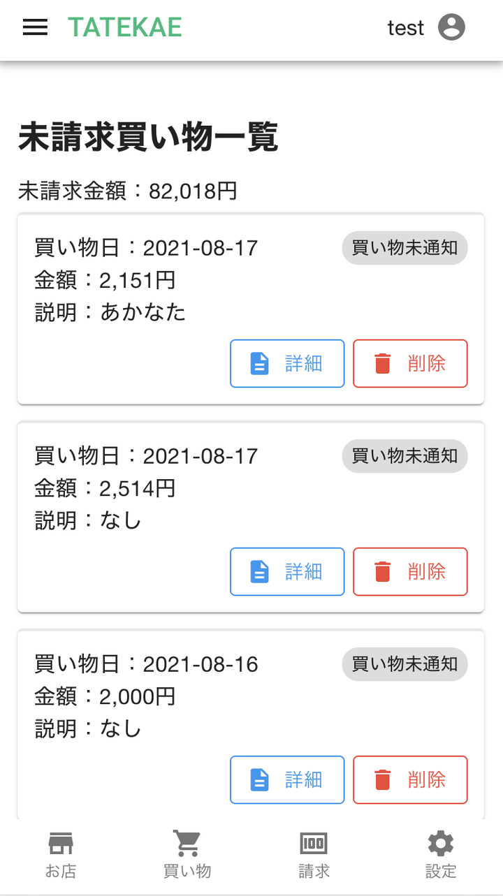 ### URL https://www.tatekae.work/ ### Front https://github.com/gonta1026/manemagi_front ### API Ruby on Rails : https://github.com/gonta1026/manemagi_api ### アプリの機能 - アプリに記録をすることでレシートを溜めることがない - LINE NOTIFYと連携させる事によって、買い物の登録、指定した買い物をまとめた請求をした時にLINEで通知をすることができる。 - 過去の買い物、請求の記録を見たい時にアプリ内で記録を見直すことができる。 主にフロントエンドですが、実装時に意識していたポイントについて下記にまとめました。 Qiita:https://qiita.com/keisei_otsuka/items/365ce3332bca39bf5f58