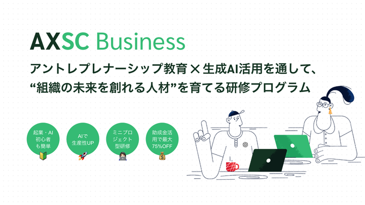 Axla G.K., a Personal Accelerator™ company headquartered in Tokyo, Japan, will officially release its corporate training program, AXSC Business, on March 19, 2025. This program is designed to nurture “people who can create the future of the organization (MiraTsuki)” through entrepreneurship education and the use of generative AI. パーソナルアクセラレーター™ Axla Inc.が、法人向け研修プログラム「AXSC Business」を提供開始 パーソナルアクセラレーター™のAxla合同会社(本社:東京都、代表:川原 ぴいすけ、以下「当社」)は、2025年3月19日から企業向け研修プログラム 「AXSC Business」 を正式リリースいたします。本プログラムは、 アントレプレナーシップ教育 ✕ 生成AI活用を通じて、“組織の未来を創れる人材(みらつく人材)” を育てる研修プログラム です。