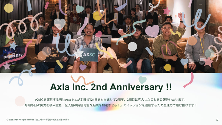 We are pleased to announce that today, January 24th, AXSC's management company, Axla Inc. Thank you to all of you with whom we have always collaborated, and to all of the AXSC students who continue to sweat and challenge with us day after day. We thank you from the bottom of our hearts and with love! 皆様いつも大変お世話になっております。AXSCを運営する当社Axla Inc.が本日1月24日をもちまして2周年、3期目に突入したことをご報告いたします。 いつも連携させていただいている皆様、そして日々共に汗をかき挑戦し続けているAXSC生の皆様、本当にいつもありがとうございます。心から愛をもって、感謝しております!