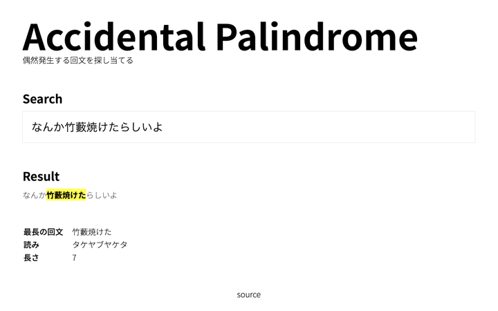 文章中に偶然含まれている回文をさがすサービスです。 Rails で簡単なサービスが作れることのデモとして作成しました。