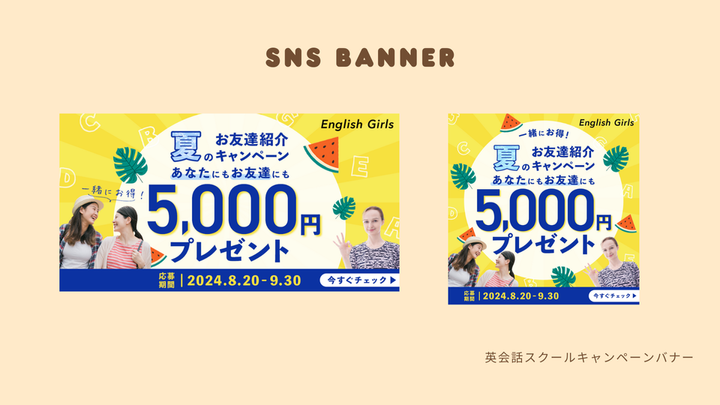 20代女性をメイン顧客とする英会話教室から依頼を受けたという設定で、全く英語が話せない苦手意識のある方でも通いやすいスクールであること、キャンペーンの利用をきっかけに入会者を増やすことを目的としたバナー制作を行いました。