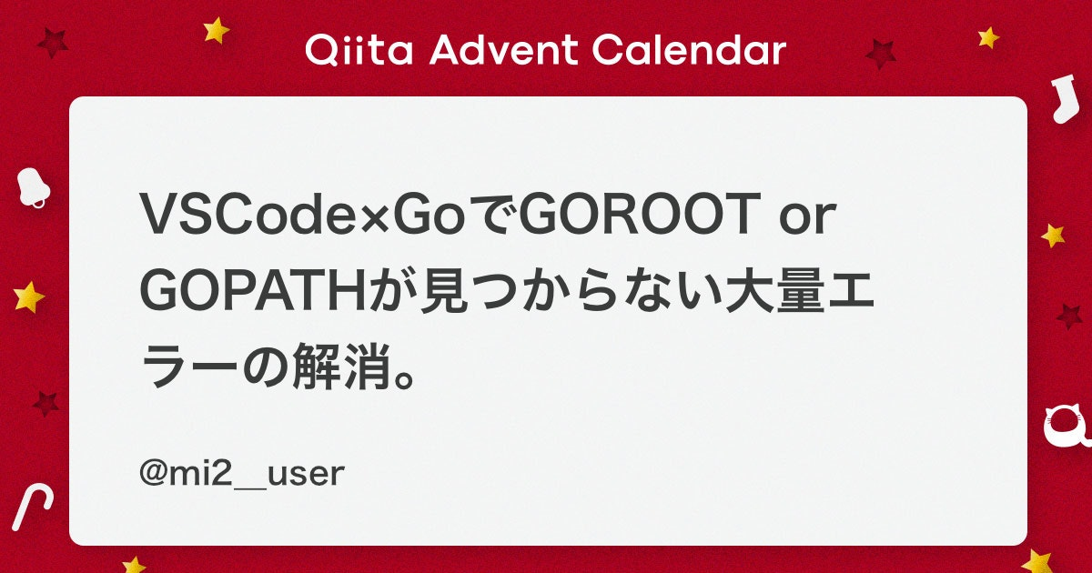 こんにちは。 フロントエンドエンジニアでバックエンドも頑張りたいみつです:relaxed: GoをVS Codeで書いているのですが、直接的な問題もなく見て見ぬふりをしていた下記のエラー。 could not import XXX (cannot find package "XXX" in GOROOT or GOPATH) 赤い線が多すぎてついに、VS Codeでエラータブでエラー数が10kに到達したのでそろそろやばいでしょ...という焦りと何が起きていたんだろうを記事にしたものです。 ちなみに、自分の場合は、Goのインストールも出来ているのと、ターミナルでGoを認識もしていたので、go.modファイルがあるディレクトリでワークスペースを開くだけでエラーの文言は消えました。