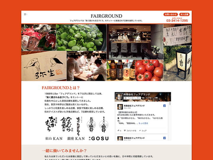 個人としての活動。 都内に飲食店を7店舗を展開する有限会社フェアグランドのコーポレートサイト兼リクルートサイトのデザイン・コーディングを担当。 ※2014年12月〜2019年9月まで。現在は他のデザイナーによってリニューアルされています。