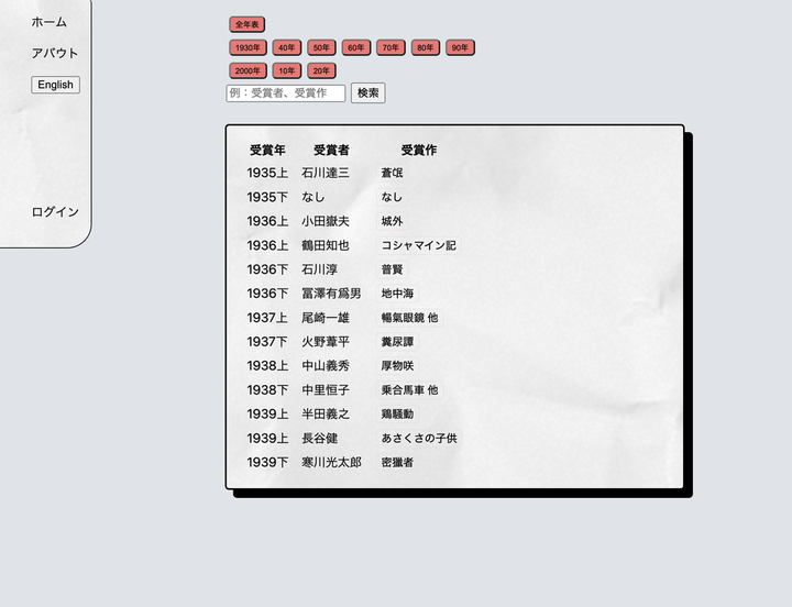 Akutagawa Prize Web Application 芥川賞のウェブアプリケーション Deployed at: https://squinnb.github.io/Akutagawa/ (React, TypeScript, Vite )