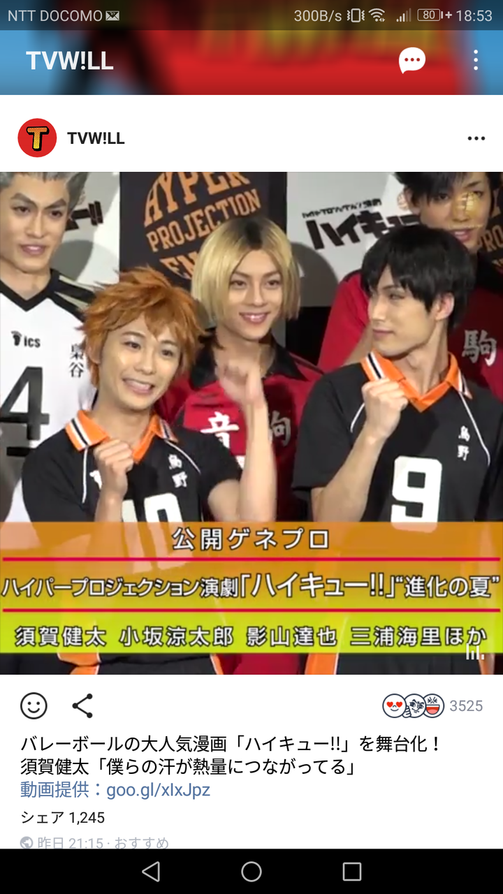 「ハイキュー!!」撮影から編集すべて制作 配信先:LINE タイムライン TVW!LL(テレビル) youtube SmartNews ネタりか ニコニコニュース オプト yahoo!映像トピックスなど