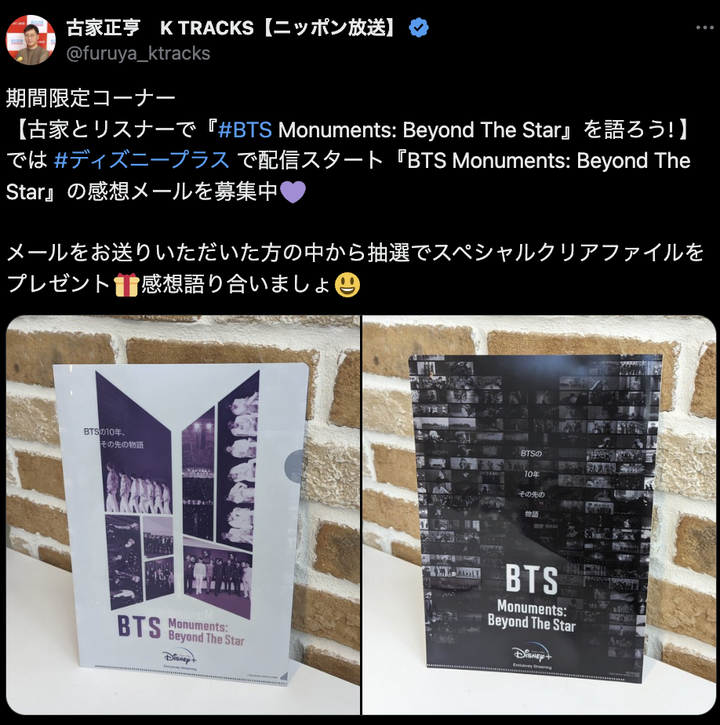 サブ放送作家として生放送時のリスナーメールピックアップ、台本制作補助 SNS運用 動画作成 企画制作補助 台本制作補助 https://twitter.com/furuya_ktracks ディズニープラス『BTS Monuments: Beyond The Star』コーナー名立案 【古家とリスナーで『#BTS Monuments: Beyond The Star』を語ろう! 】