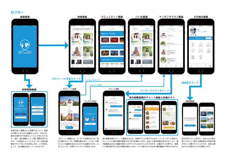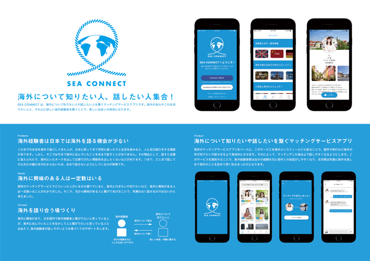 2018年度のvivivit主催のUI展の展示作品として、海外について知りたい人と話したい人を繋ぐマッチングサービスアプリを考案しました。高校までのほとんどを海外で暮らしていた経験を生かして、日本での生活を始めてから感じた問題を挙げて考えました。