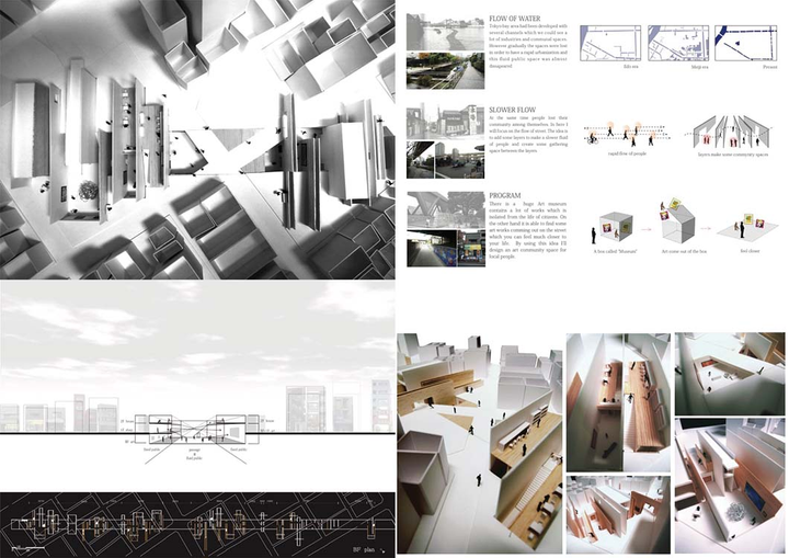 美術館というビルディングタイプの公共空間のあり方に着目し、清澄白河駅から東京都現代美術館までを敷地として、駅という非常に流動的な公共空間と東京都現代美術館という新しい流動性を持つ公共建築を繋ぎ、始点と終点の間に新たな流動性を創出することを目的とし設計しました。