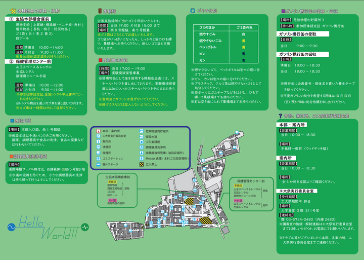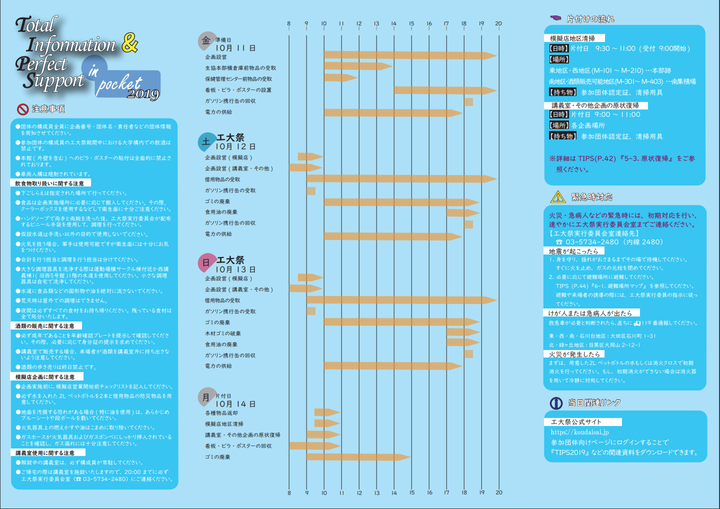 工大祭当日に参加団体がどこで何をするべきなのか、 明確にわかりやすく、A3両面フルカラーにまとめた資料 Illustratorを使った。