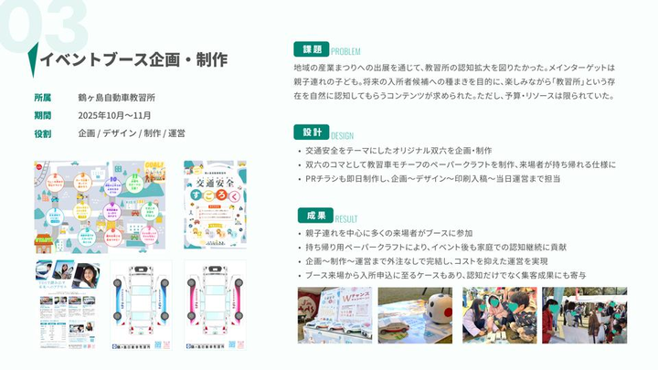 教習所の認知拡大およびブランディング形成を目的に、地域の親子連れをターゲットとした体験型コンテンツの提供を、企画から当日の運営まで一貫して担当しました。 コンテンツ設計: 「将来の入所者候補」への種まきとして、楽しみながら教習所を認知してもらう「交通安全をテーマにしたオリジナル双六」を企画・制作しました。 クリエイティブ制作: 双六のコマとして「教習車をモチーフにしたペーパークラフト」を制作し、来場者が自宅に持ち帰れる仕様に設計。あわせてPRチラシの即日制作・印刷入稿も自ら完結させました。 成果: 予算・リソースが限られる中、外注なしで完結させコストを抑えた運営を実現。多くの親子連れにブースへ参加いただき、後日の入所申込に至るケースも出るなど、認知拡大だけでなく集客成果にも寄与しました。
