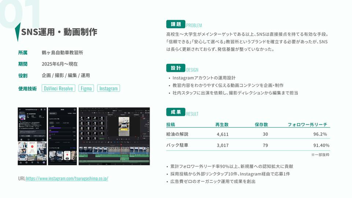 「教習は厳しい、怖い」といった、ユーザーが抱く負の先入観や心理的ハードルを起点に、その不安を解消するためのクリエイティブ制作を行いました。 具体的にはInstagramの運用と動画制作を担当。これまでバラバラだった発信内容を「教習所の日常や人柄が伝わるトーン」に統一しました。現場での撮影から編集までを自ら一貫して行い、テキストでは伝わらない「空気感」を可視化することで、ユーザーが安心して選べるブランドイメージを構築しています。 「何を作るか」の前に、ユーザーの心理的な壁をどう取り除くかというコミュニケーション設計を大切にしています。