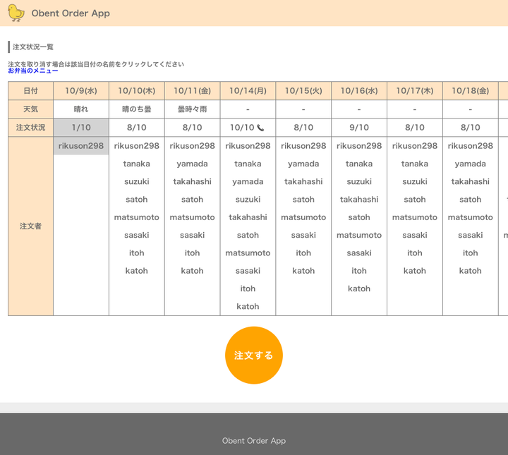 宅配弁当を利用する人が希望日を登録し、集計するアプリです。 実際に社内運用されていました。 バックエンドがRails、フロントエンドがVueのSPAです。